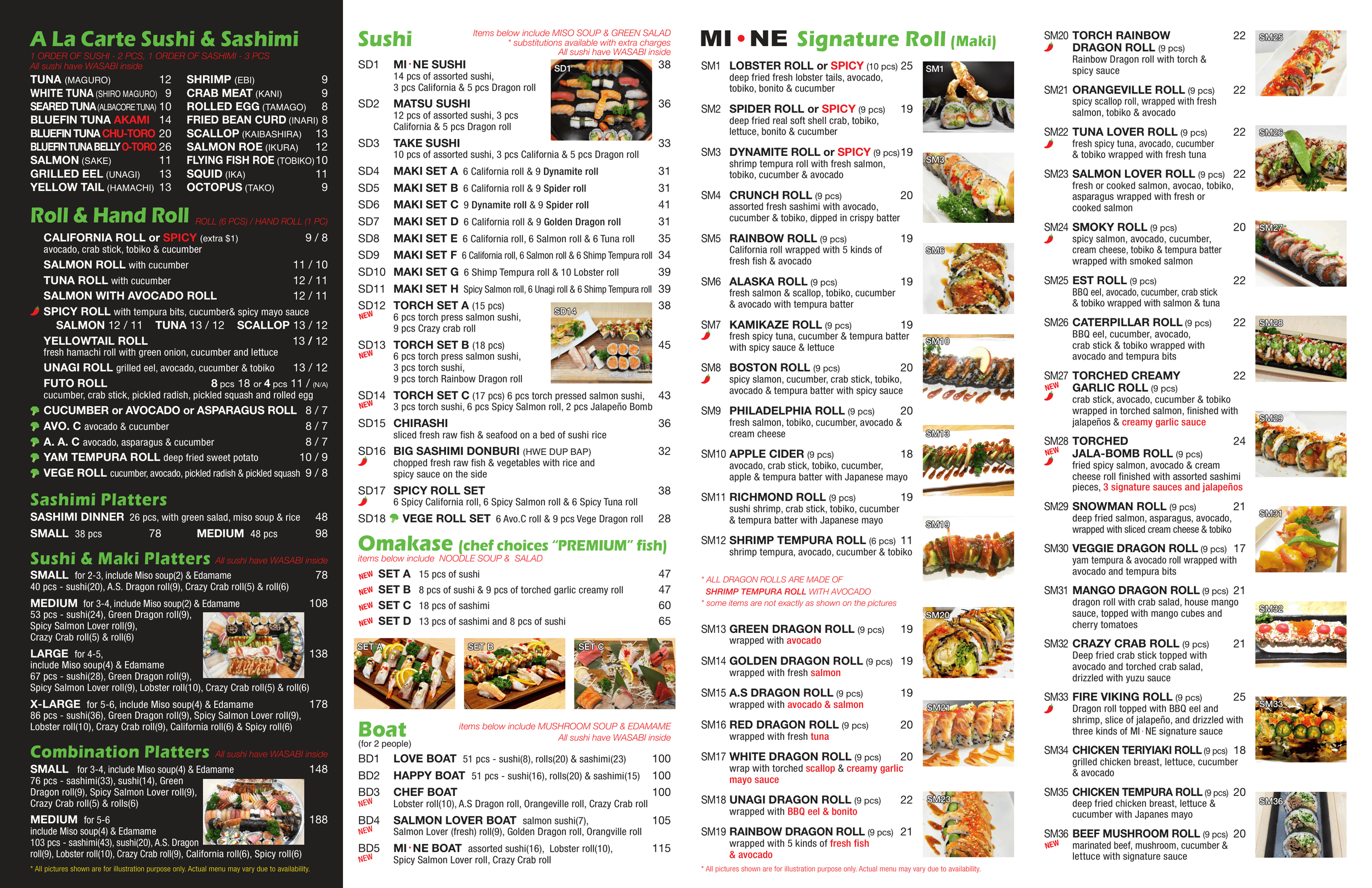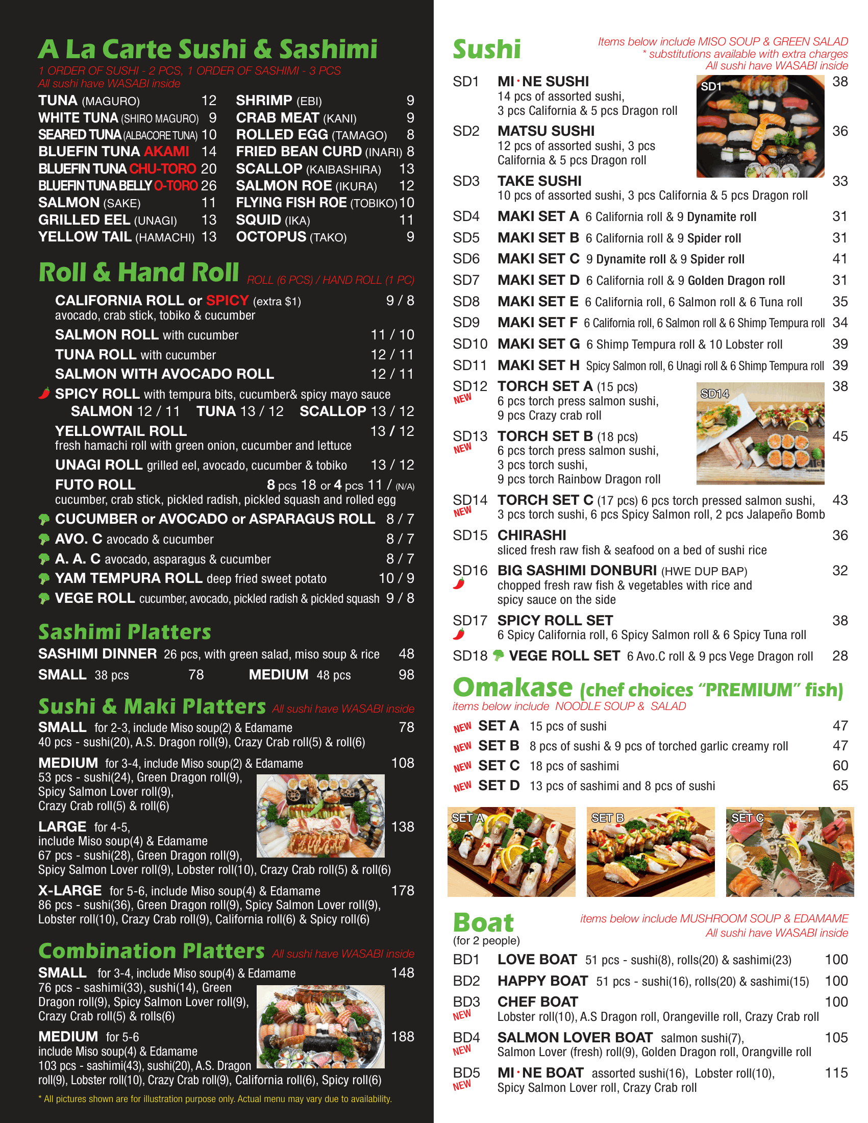 Menu for a Japanese restaurant featuring lunch specials, sushi combo lunch options, veggie roll set lunch, and torch combo, with pictures of assorted sushi and sushi platters.