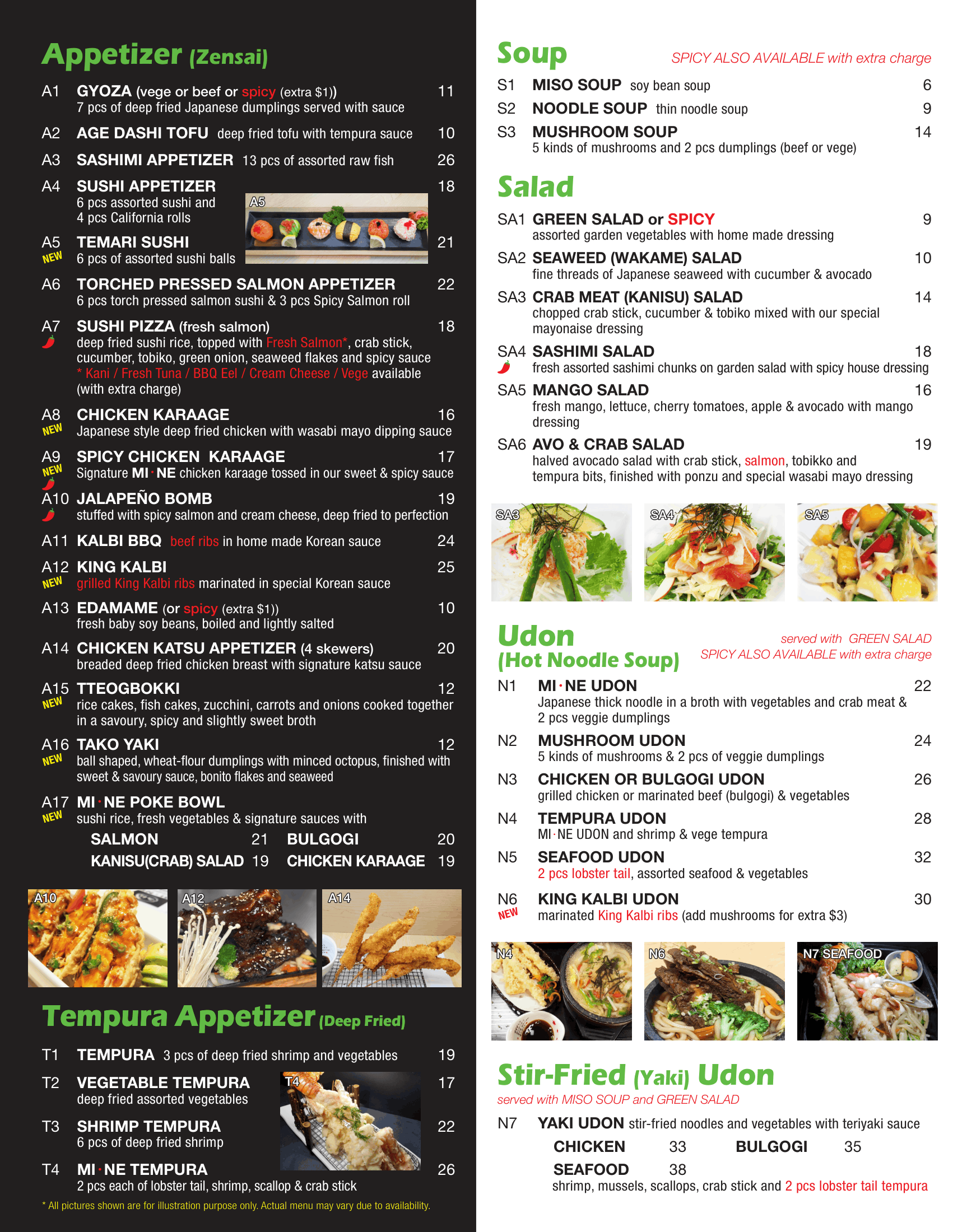 Menu offering Japanese lunch specials with photos of different bento boxes, including sashimi, chicken teriyaki, salmon teriyaki, beef teriyaki, spicy chicken, spicy seafood, tempura lunch, bulgogi lunch, kalbi lunch, veggie lunch box, veggie tempura lunch, and chicken katsu, each with description and prices.